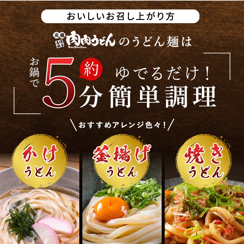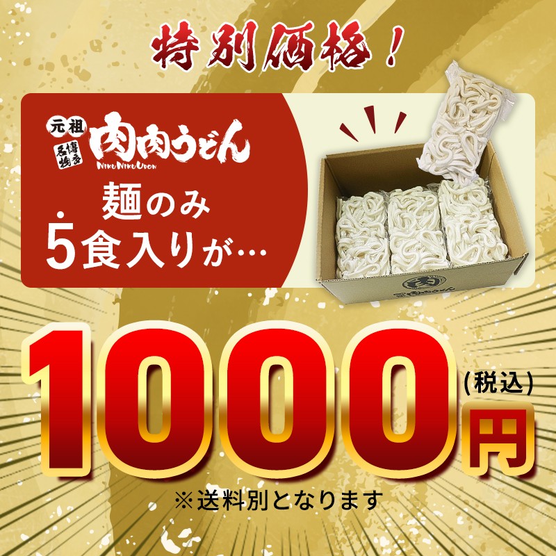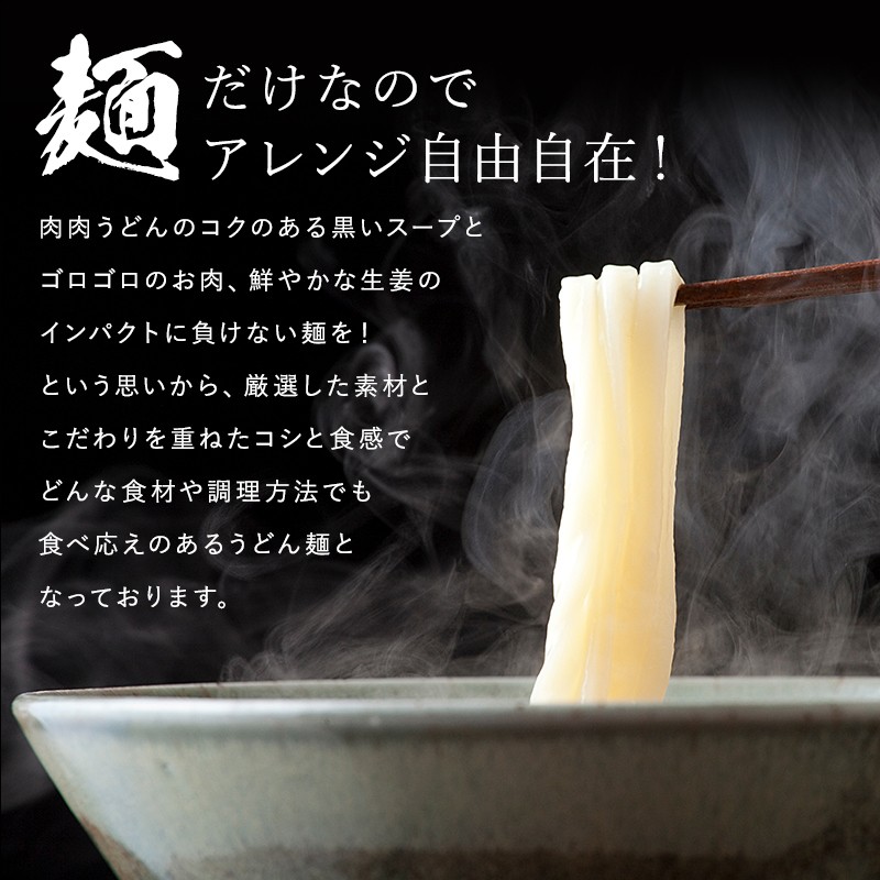 肉肉うどんのうどん麺5玉! お店で多くの方が注文される「うどんの替玉」をご自宅でもお楽しみ頂けるよう致しました。 替玉以外にも様々な用途でご利用頂けるうどん麺です。
